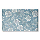 This is a seamless, monochromatic floral pattern featuring stylized white and gray flowers with swirling stems and leaves. Set against a textured, muted blue background, the elegant design has an intricate, embossed quality, giving it a vintage, decorative appearance.