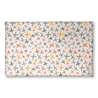 A seamless, modern pattern of stylized four-petaled flowers in varying sizes. The design features a muted, earthy color palette of green, orange, and yellow scattered playfully across a light, off-white background for a whimsical and abstract look.