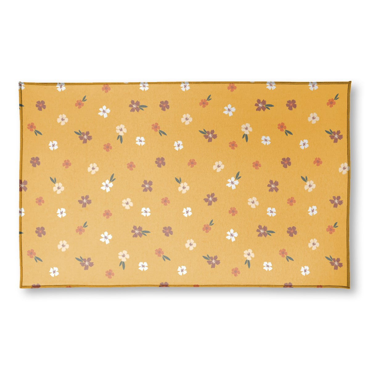This is a seamless floral pattern featuring small, stylized flowers in white, brown, and rust-orange scattered across a solid mustard-yellow background. Some flowers have tiny green leaves, creating a warm, rustic design.