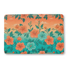 A vibrant, retro-style pattern of orange and teal hibiscus flowers with dark green leaves. The background is a stylized sunset gradient, shifting from warm orange to cool turquoise, with subtle clouds creating a serene, tropical atmosphere.