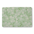 A vintage-style seamless pattern featuring delicate white flowers on gracefully swirling green vines. The intricate, elegant design is set against a soft, muted sage green background with subtle decorative swirls, creating a classic and serene composition.