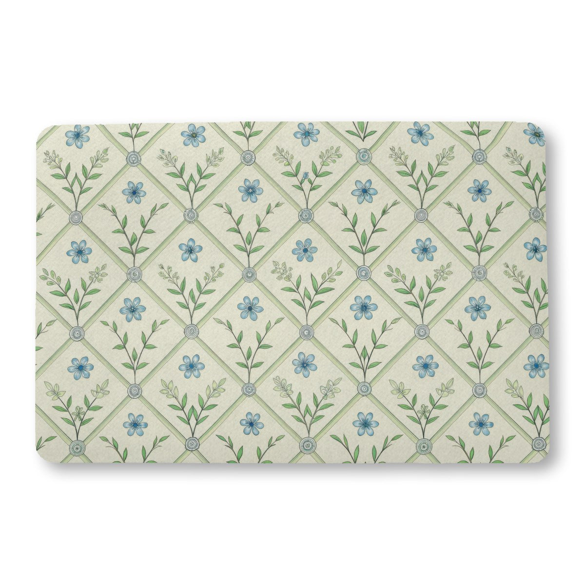 A seamless botanical pattern featuring a light green diagonal trellis on a cream background. The diamond shapes contain alternating motifs of a single blue flower and a leafy green sprig, creating a delicate, vintage-inspired design suitable for wallpaper or fabric.