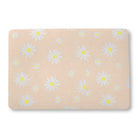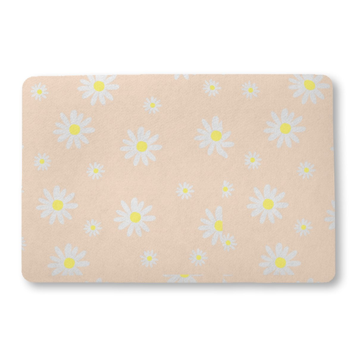 This is a simple, seamless pattern of stylized daisies. White flowers with yellow centers, in various sizes, are scattered across a soft, pale peach background for a sweet and gentle effect.