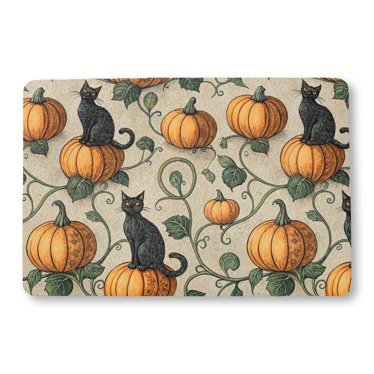A vintage-style seamless pattern features black cats with glowing orange eyes perched on pumpkins. Swirling green vines and leaves connect the elements on a textured, light background, creating a classic Halloween-themed illustration with a slightly spooky feel.