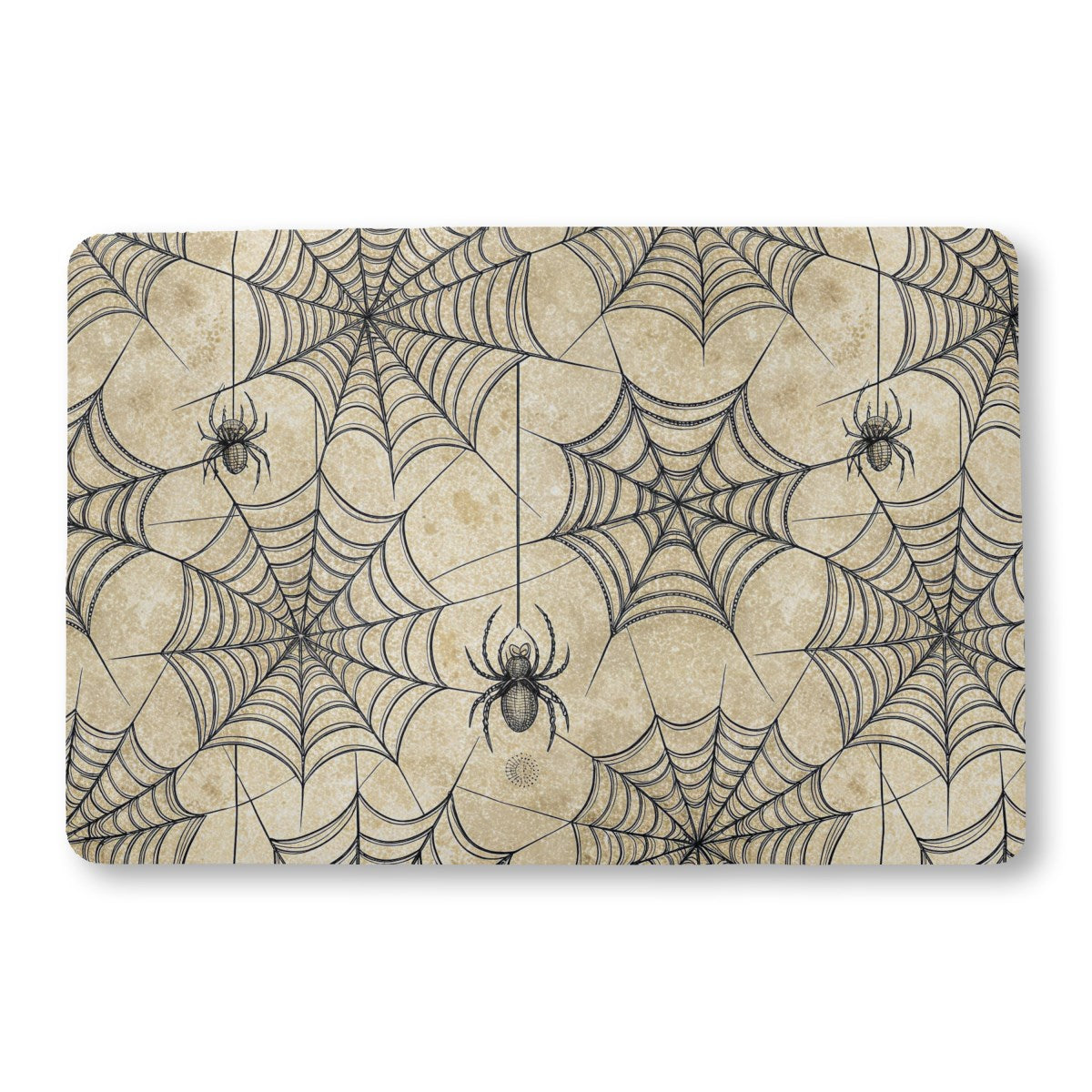 This vintage-style illustration features an intricate, repeating pattern of black spiderwebs on a textured, parchment-like background. Two detailed spiders are present, one crawling on a web and another dangling from a thread, creating a classic spooky or Halloween-themed design.