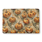 This is a spooky, seamless Halloween pattern of menacing jack-o'-lanterns. Each pumpkin features a unique, glowing, evil face and rests on gnarled, swirling tendrils against a textured, parchment-like background, creating an eerie and festive design.