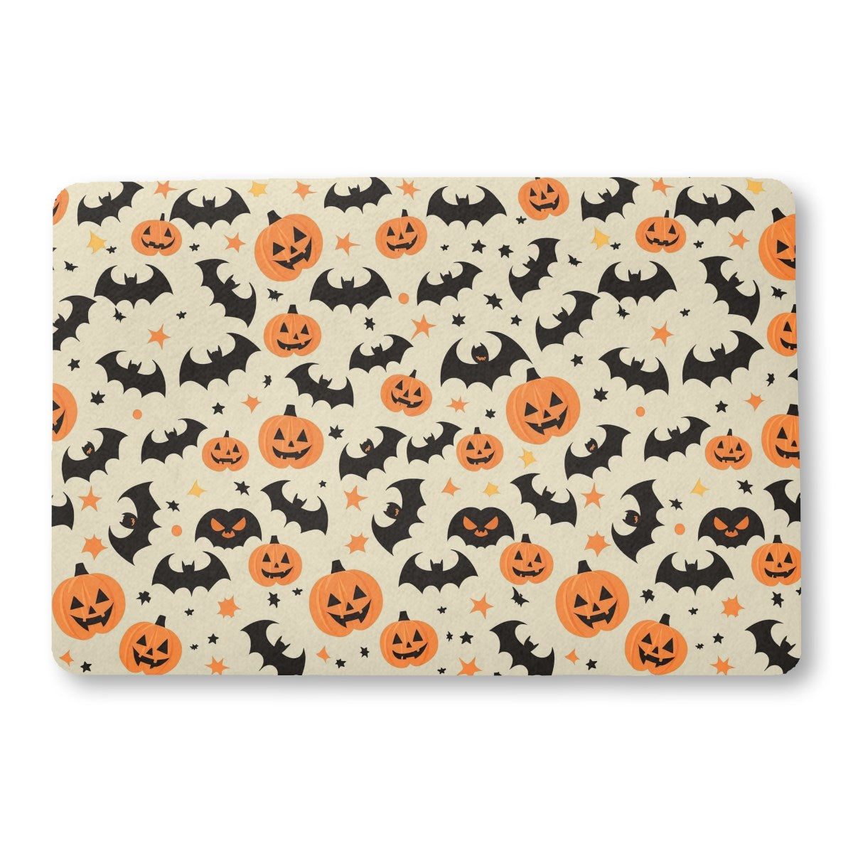 A cheerful, seamless Halloween pattern featuring smiling jack-o'-lanterns, black bat silhouettes, and small stars. The festive cartoon design is set against a light cream-colored background, creating a fun and spooky theme.