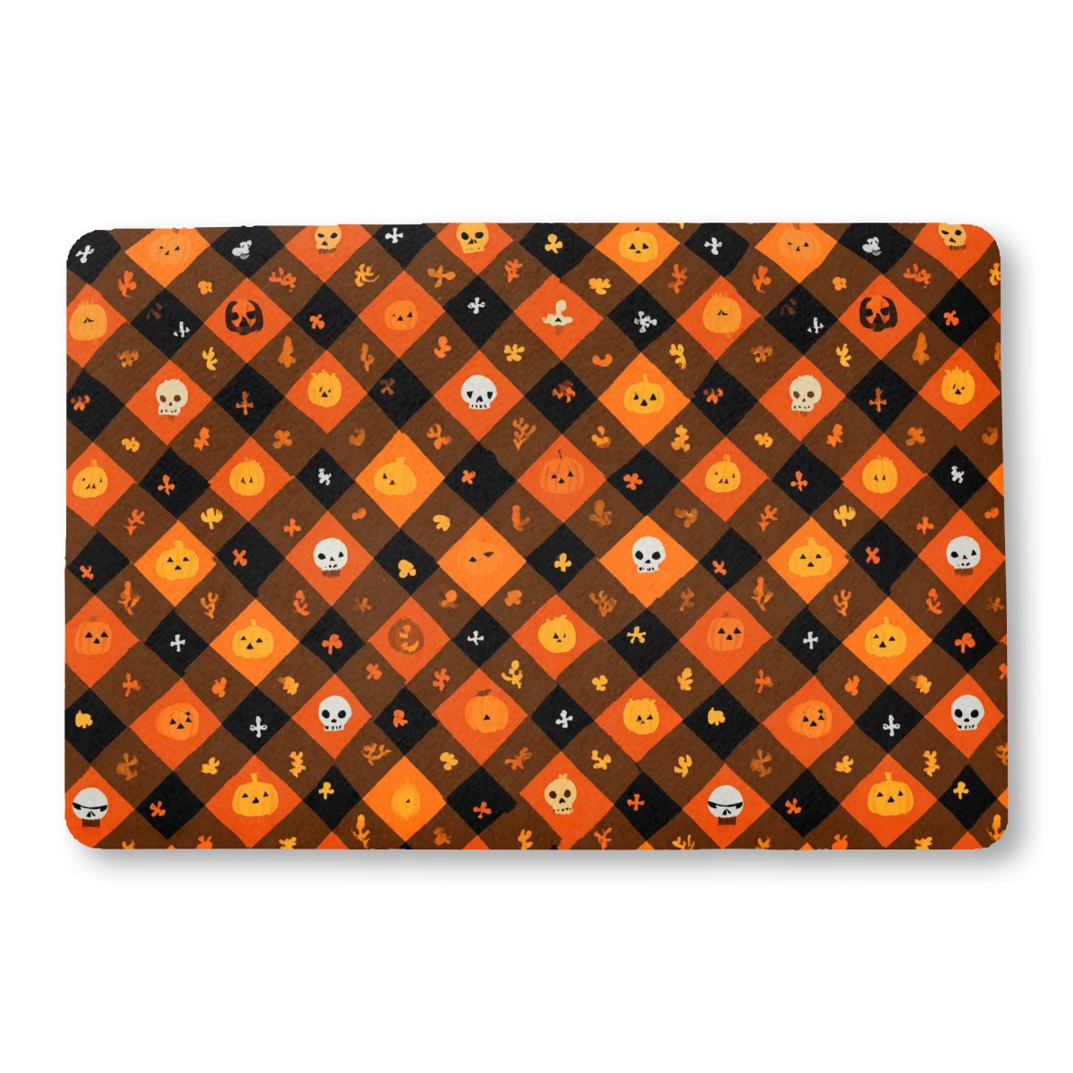 A whimsical, seamless Halloween pattern featuring a diagonal plaid in orange, black, and brown. The design is scattered with hand-drawn, cartoonish skulls, jack-o'-lanterns, and other small autumnal motifs, creating a festive and spooky-cute feel.