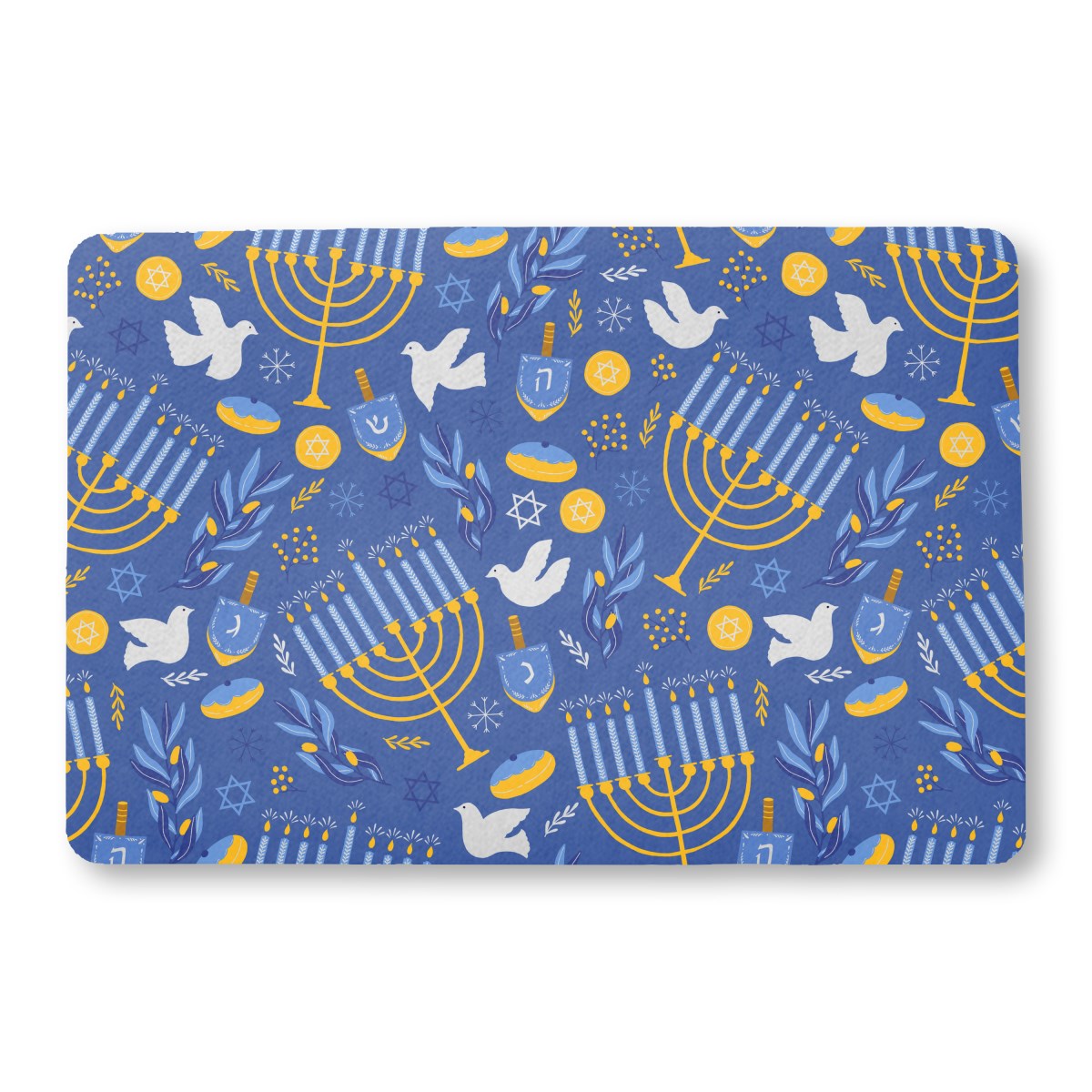 A festive, repeating pattern celebrating Hanukkah on a blue background. The design features illustrations of menorahs, dreidels, sufganiyot (doughnuts), Stars of David, and white doves in a cheerful yellow, blue, and white color palette, creating a joyful holiday theme.