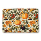 A vintage-style pattern illustrates a bountiful autumn harvest. Orange pumpkins, mottled gourds, grapes, and berries are interwoven with colorful fall leaves and twisting vines against a cream background, evoking a sense of seasonal abundance.
