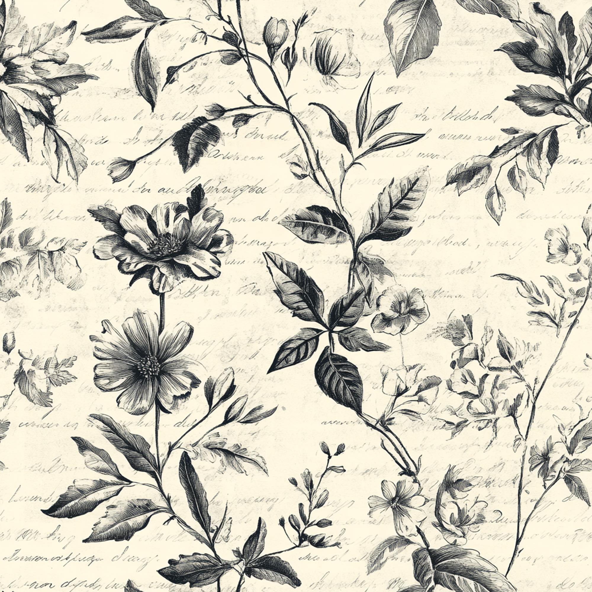 This is a vintage-style pattern featuring detailed, black-and-white botanical illustrations of flowers and leaves. The sketches are layered over a cream background with faint, elegant handwritten script, creating a romantic and classic design.