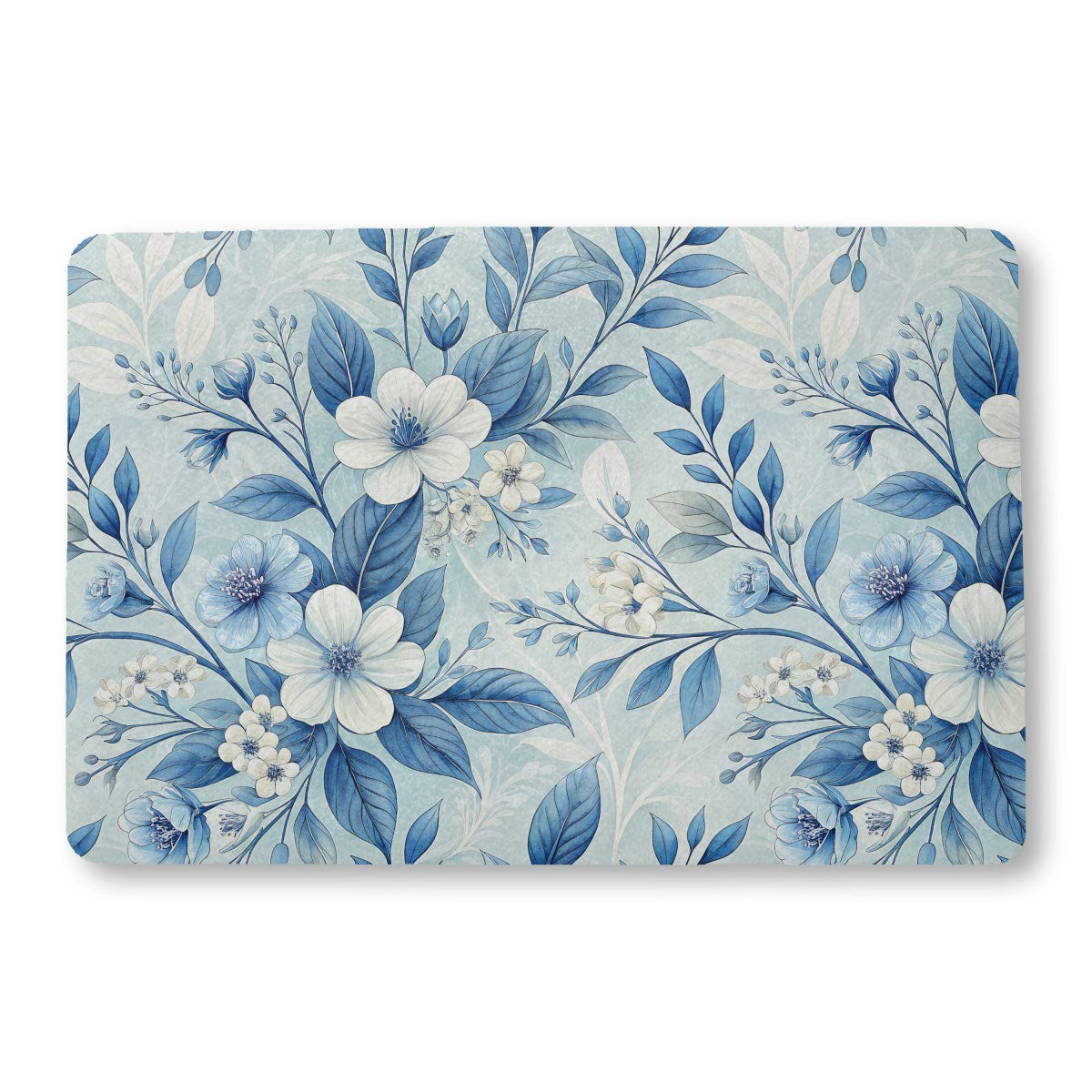 An elegant floral pattern featuring intricate white and blue blossoms with deep blue leaves. The delicate arrangement is set against a soft, textured, light blue background, creating a serene and classic design with a watercolor-like feel.