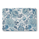 An elegant, seamless floral pattern in shades of blue on a white background. The design features large, stylized peonies or chrysanthemums with intricate linework, interwoven with scrolling vines and leaves, creating a classic, decorative look reminiscent of traditional porcelain.