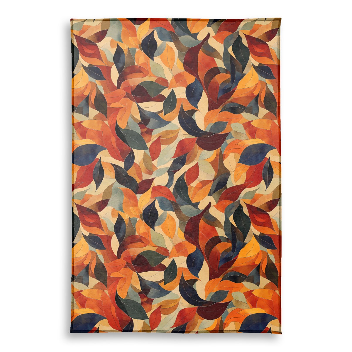A stylized, abstract pattern of overlapping autumn leaves fills the frame. A rich, warm palette of orange, red, and brown is contrasted by deep blues and dark greens, creating a dynamic, mosaic-like texture reminiscent of stained glass.