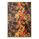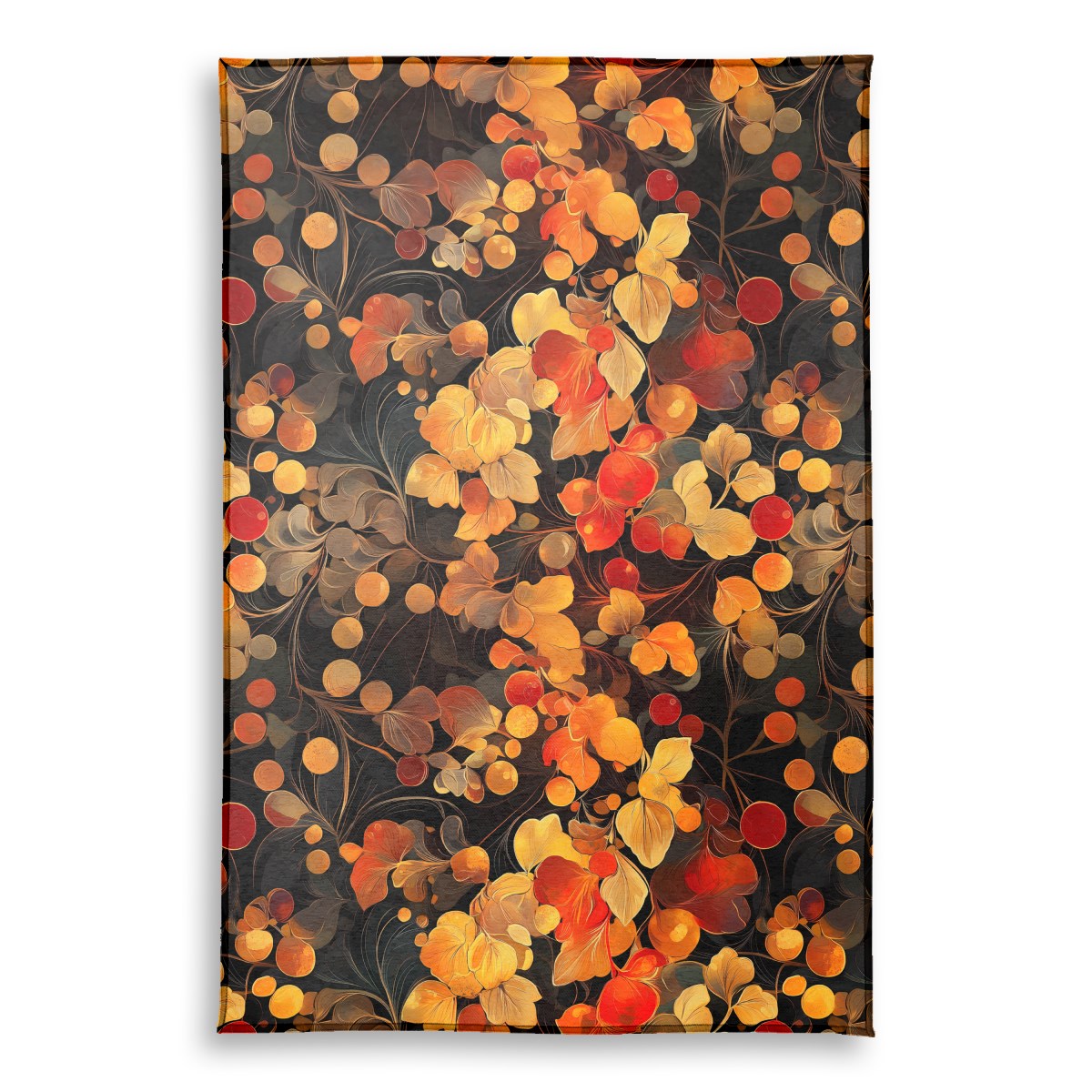 A vibrant, stylized botanical pattern features glowing leaves and berries in warm autumnal shades of orange, red, and yellow. The elegant, swirling elements are set against a dark background, creating a rich and dynamic composition with a painterly feel.