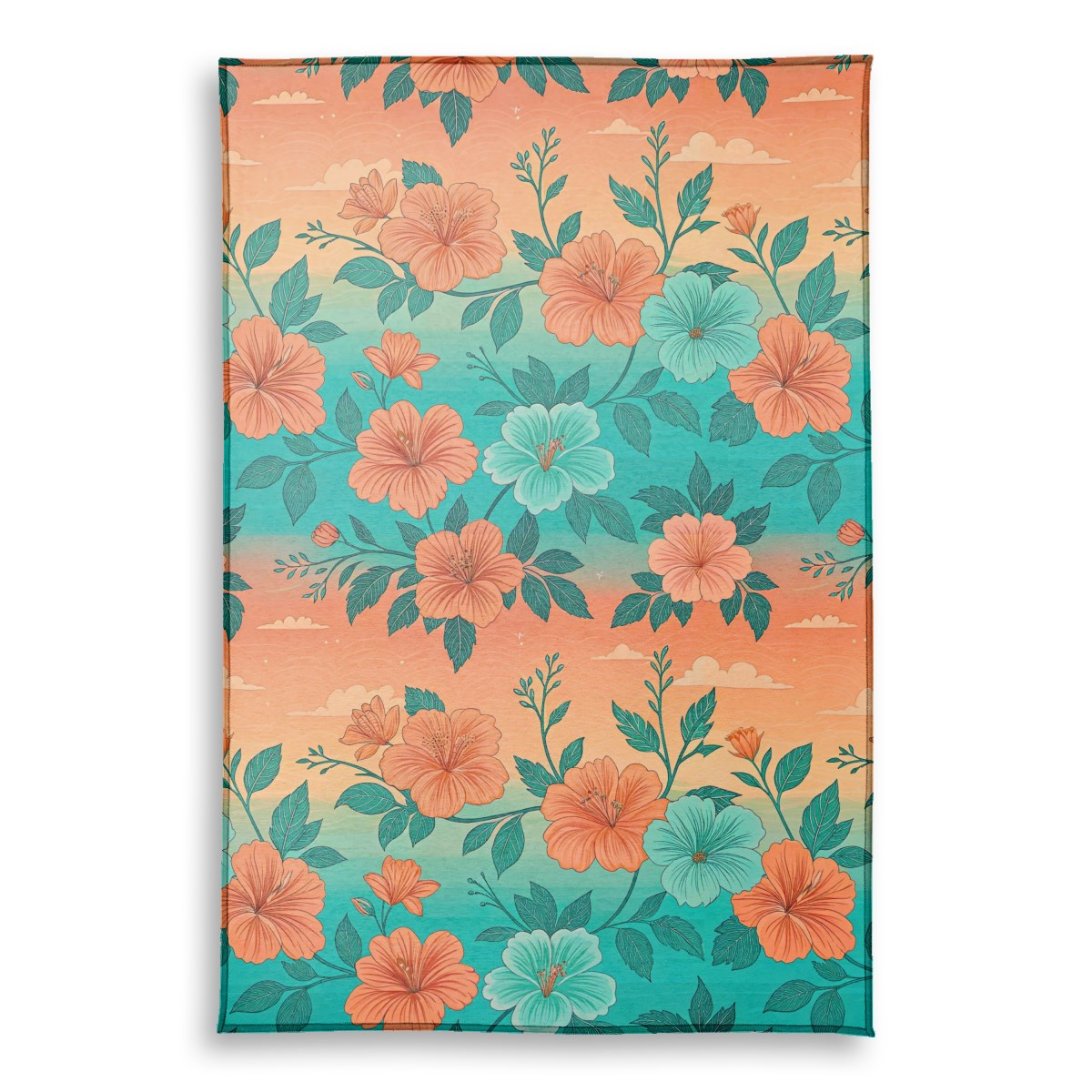 A vibrant, retro-style pattern of orange and teal hibiscus flowers with dark green leaves. The background is a stylized sunset gradient, shifting from warm orange to cool turquoise, with subtle clouds creating a serene, tropical atmosphere.