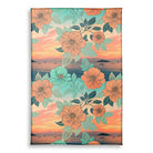 This composite image blends a stylized floral pattern with a realistic ocean sunset. Bold orange and turquoise flowers are overlaid on a serene seascape featuring sailboats and distant islands under a vibrant, cloudy sky, creating a unique artistic collage.