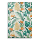 A vibrant, stylized illustration of a tropical pattern featuring orange Bird of Paradise flowers and lush greenery. Various leaves, including green Monstera and palm fronds, plus a contrasting golden frond, are set against a clean, off-white background for a fresh, exotic look.