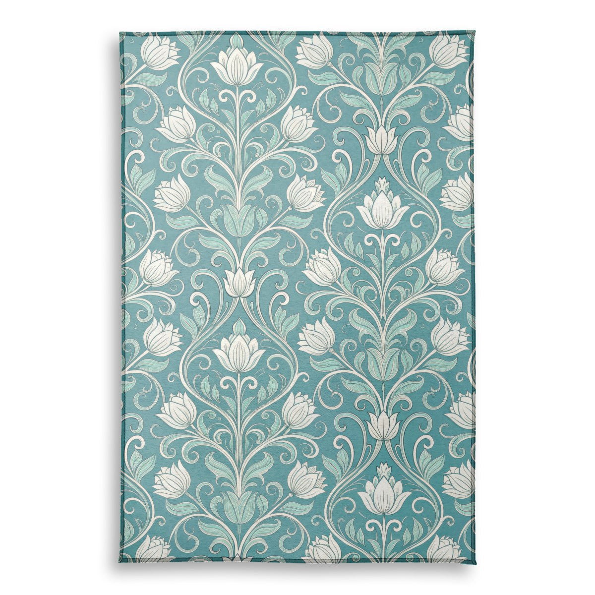 An elegant, symmetrical floral pattern in the Art Nouveau style. Stylized white and mint-green flowers are connected by swirling vines on a rich teal background, creating an intricate and decorative design reminiscent of vintage wallpaper.