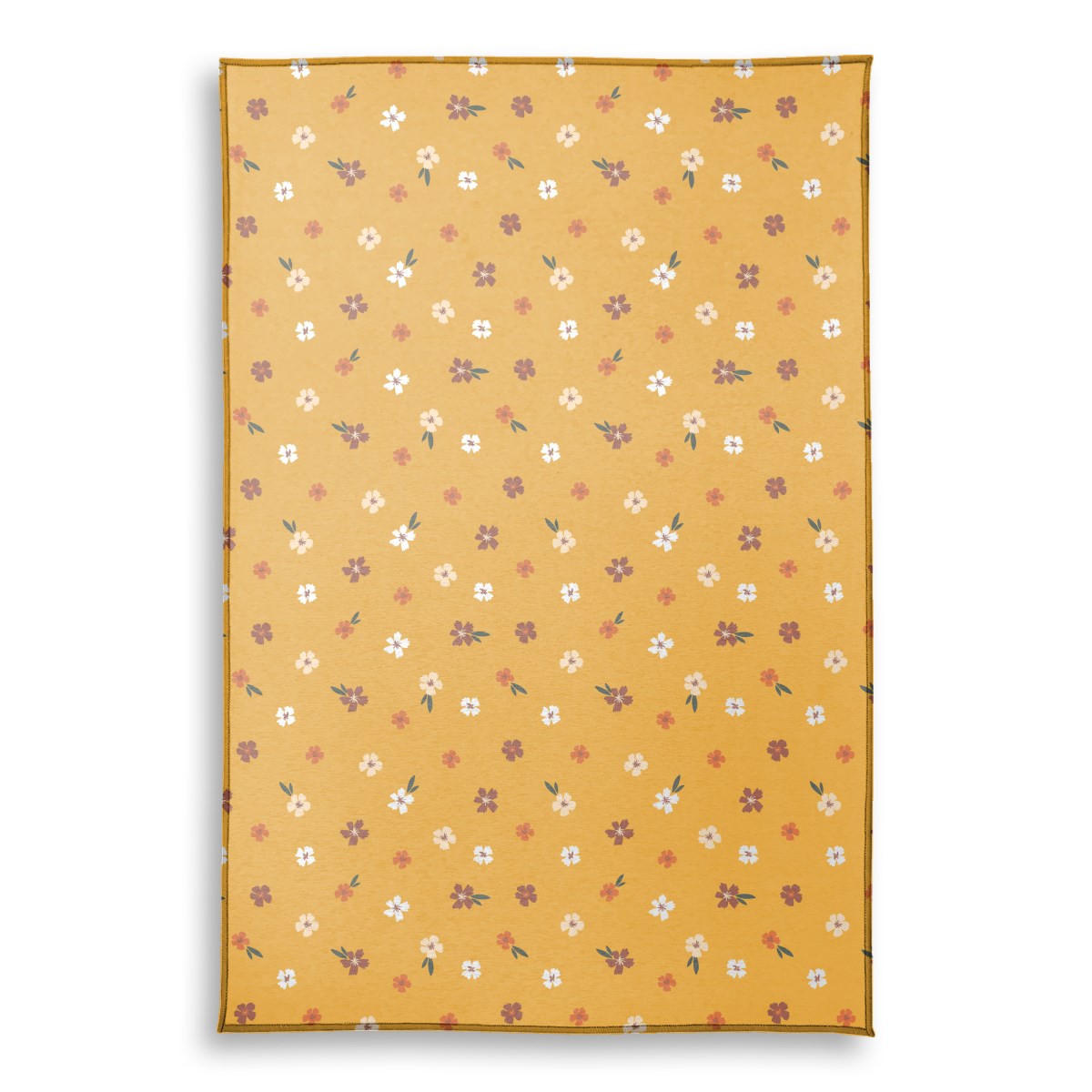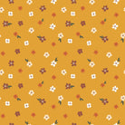 This is a seamless floral pattern featuring small, stylized flowers in white, brown, and rust-orange scattered across a solid mustard-yellow background. Some flowers have tiny green leaves, creating a warm, rustic design.