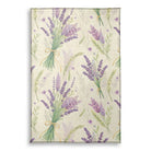 This is a watercolor-style botanical pattern of purple lavender. Bouquets and loose sprigs are scattered across a textured, light beige background. A prominent bunch tied with a yellow ribbon creates a central focus in this charming, rustic design.