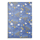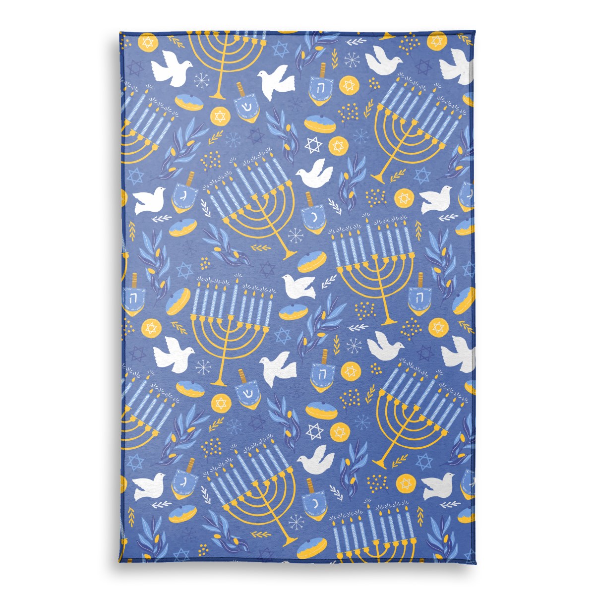 A festive, repeating pattern celebrating Hanukkah on a blue background. The design features illustrations of menorahs, dreidels, sufganiyot (doughnuts), Stars of David, and white doves in a cheerful yellow, blue, and white color palette, creating a joyful holiday theme.