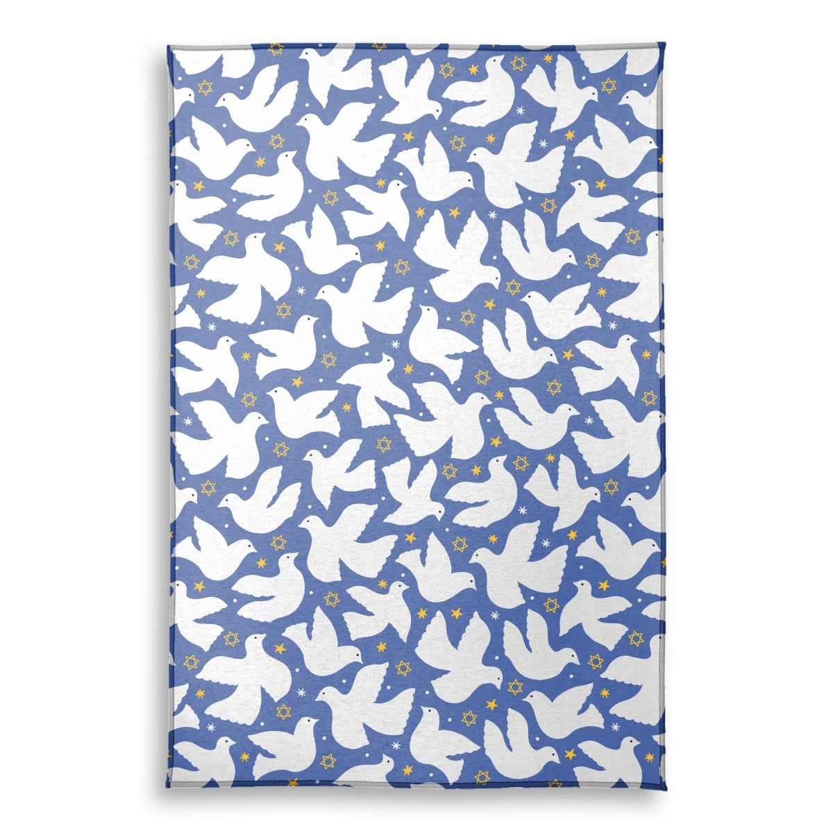 A seamless pattern of stylized white doves flying against a blue background. The design is scattered with yellow Stars of David and smaller stars, creating a symbolic and peaceful motif with Jewish themes.