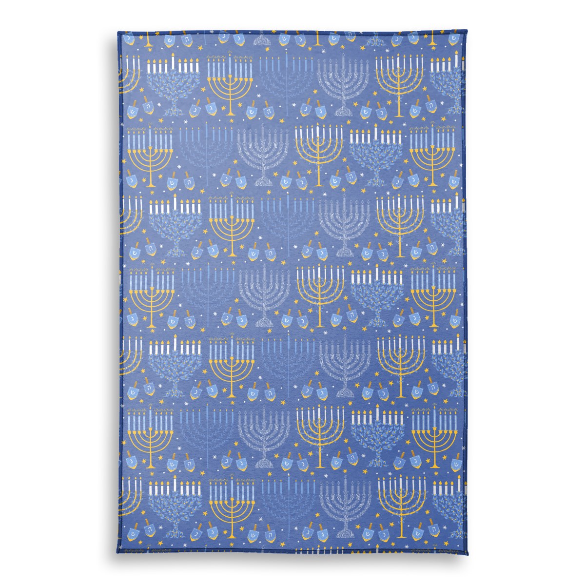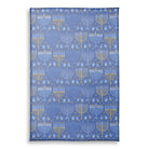 This is a festive, repeating Hanukkah pattern on a blue background. The illustration features various stylized menorahs, dreidels, lit candles, and stars in a cheerful color palette of blue, yellow, and white, celebrating the Jewish holiday.