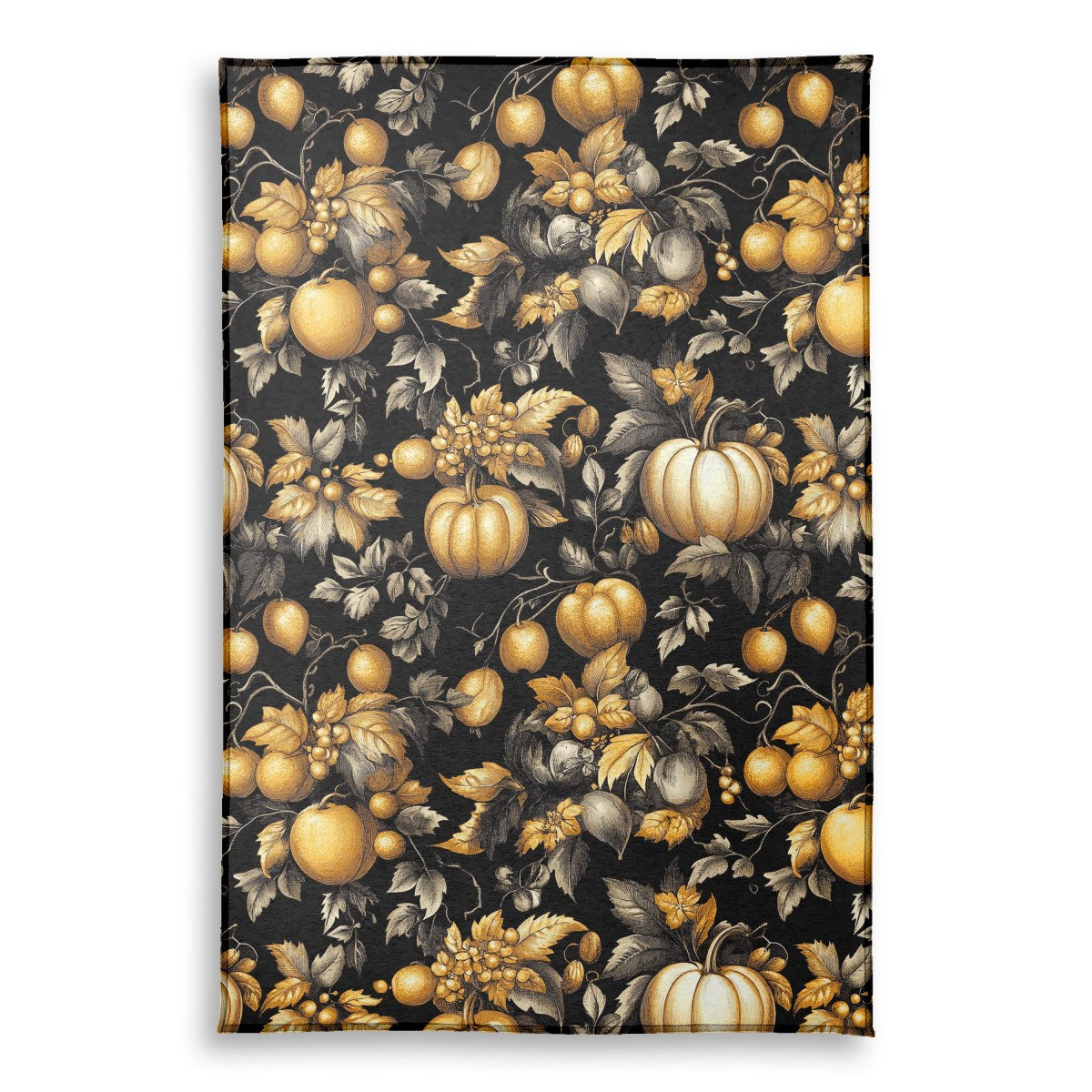 A luxurious, vintage-style pattern of autumnal fruits and foliage. Rendered in a detailed engraving style, golden pumpkins, apples, and grapes contrast richly with silver-toned leaves against a dramatic black background, creating an opulent and seamless design.