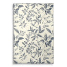 This seamless pattern features vintage-style botanical illustrations in dark blue. Detailed, engraved leaves, flowers, and berries are layered over a cream-colored background with faint, handwritten cursive script, creating a classic and elegant design.