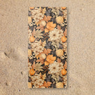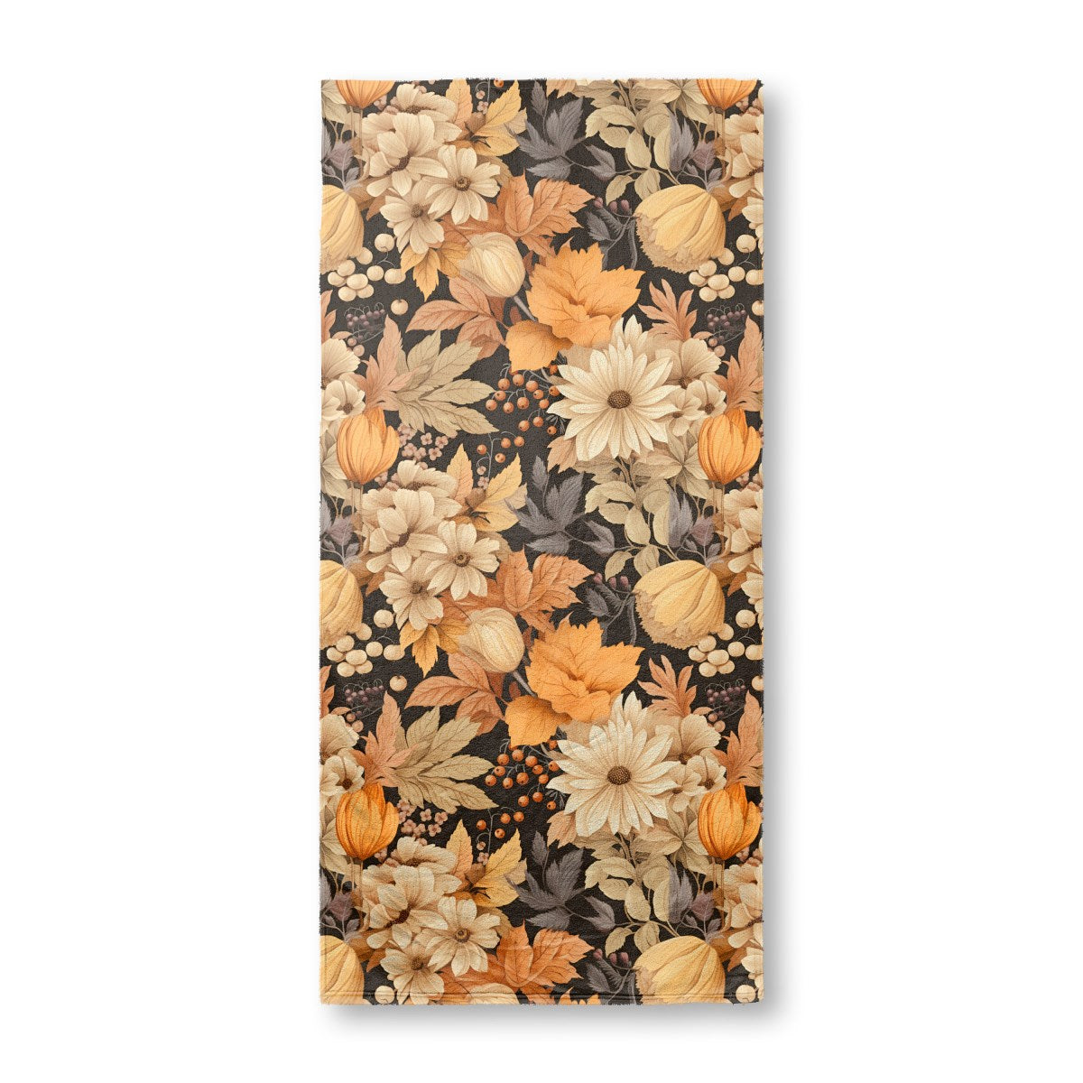 This is a seamless botanical pattern featuring autumn flora. A warm palette of orange, cream, and muted tones for flowers, leaves, and berries is set against a dark background, creating a rich, elegant, and vintage-inspired design with a cozy, autumnal feel.