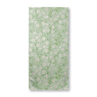 A vintage-style seamless pattern featuring delicate white flowers on gracefully swirling green vines. The intricate, elegant design is set against a soft, muted sage green background with subtle decorative swirls, creating a classic and serene composition.