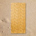 This is a seamless floral pattern featuring small, stylized flowers in white, brown, and rust-orange scattered across a solid mustard-yellow background. Some flowers have tiny green leaves, creating a warm, rustic design.
