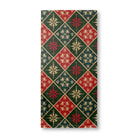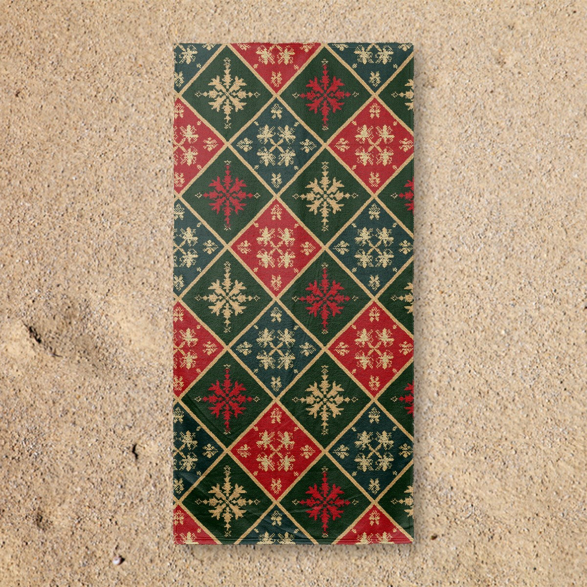 A festive, knitted textile pattern featuring red, green, and dark blue diamonds outlined in gold. Each diamond contains intricate snowflake motifs, evoking the cozy feel of a traditional Christmas sweater or tapestry.