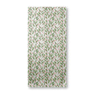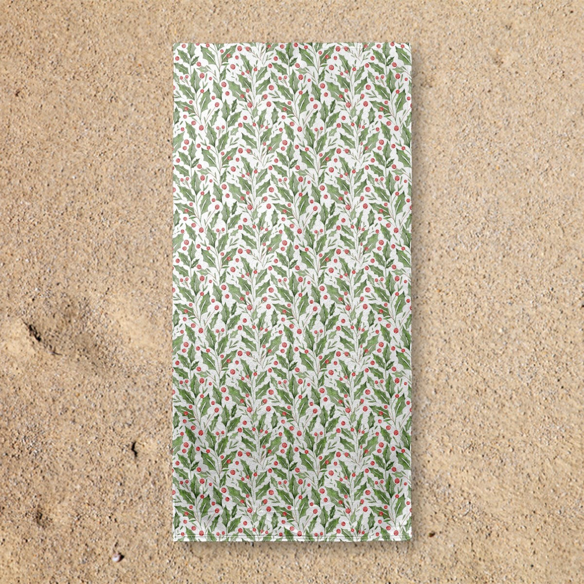 This is a seamless watercolor pattern of festive holly. Spiky green leaves and bright red berries are arranged in vertical sprigs against a white background, creating a classic and cheerful Christmas design.