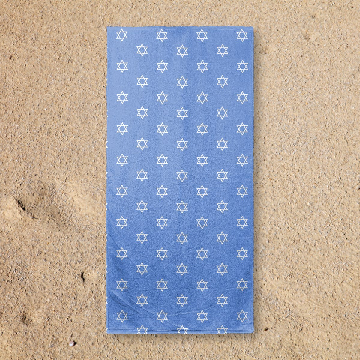 A seamless pattern features white Stars of David, a well-known symbol of Judaism, arranged in an orderly grid against a solid blue background.