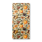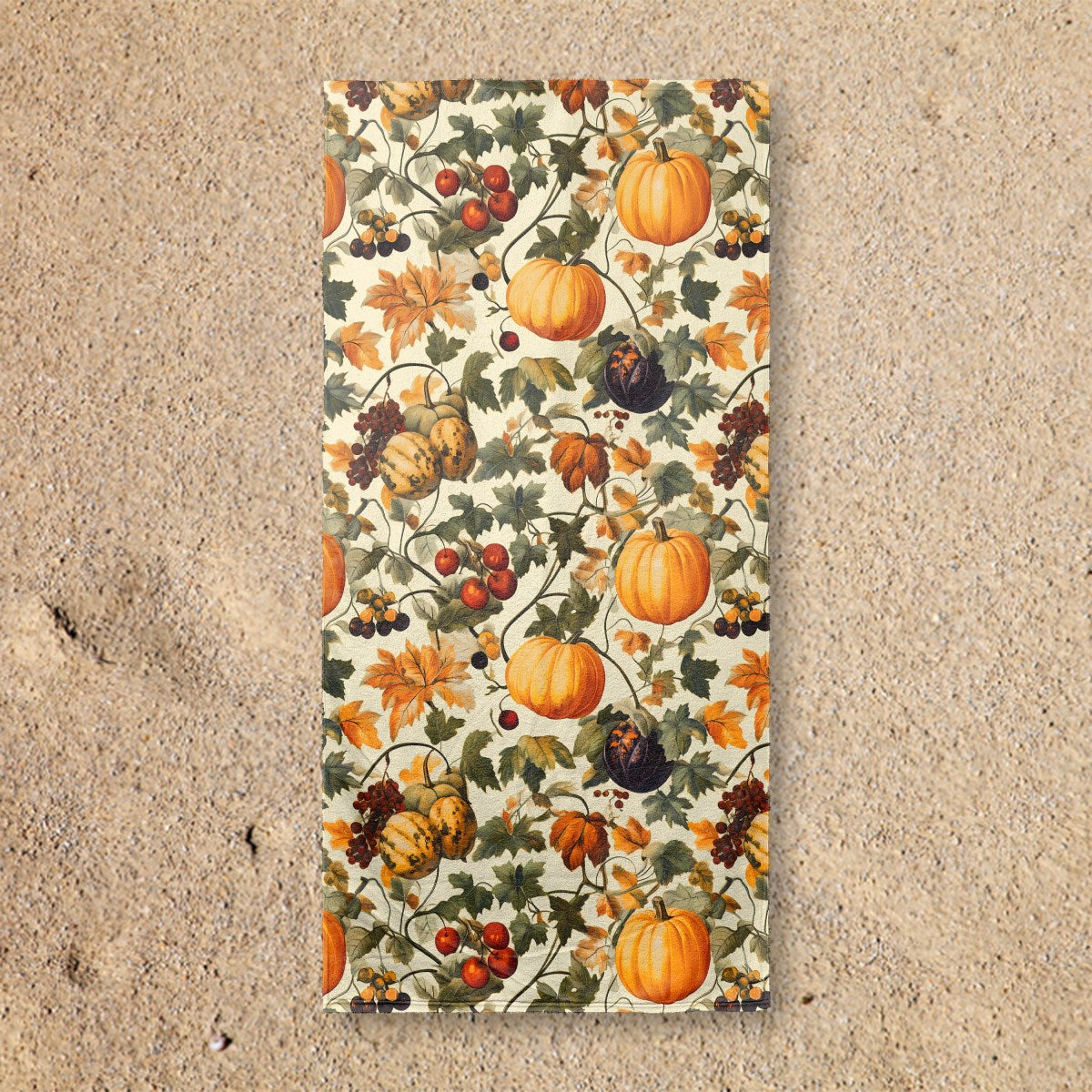 A vintage-style pattern illustrates a bountiful autumn harvest. Orange pumpkins, mottled gourds, grapes, and berries are interwoven with colorful fall leaves and twisting vines against a cream background, evoking a sense of seasonal abundance.