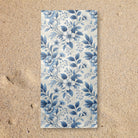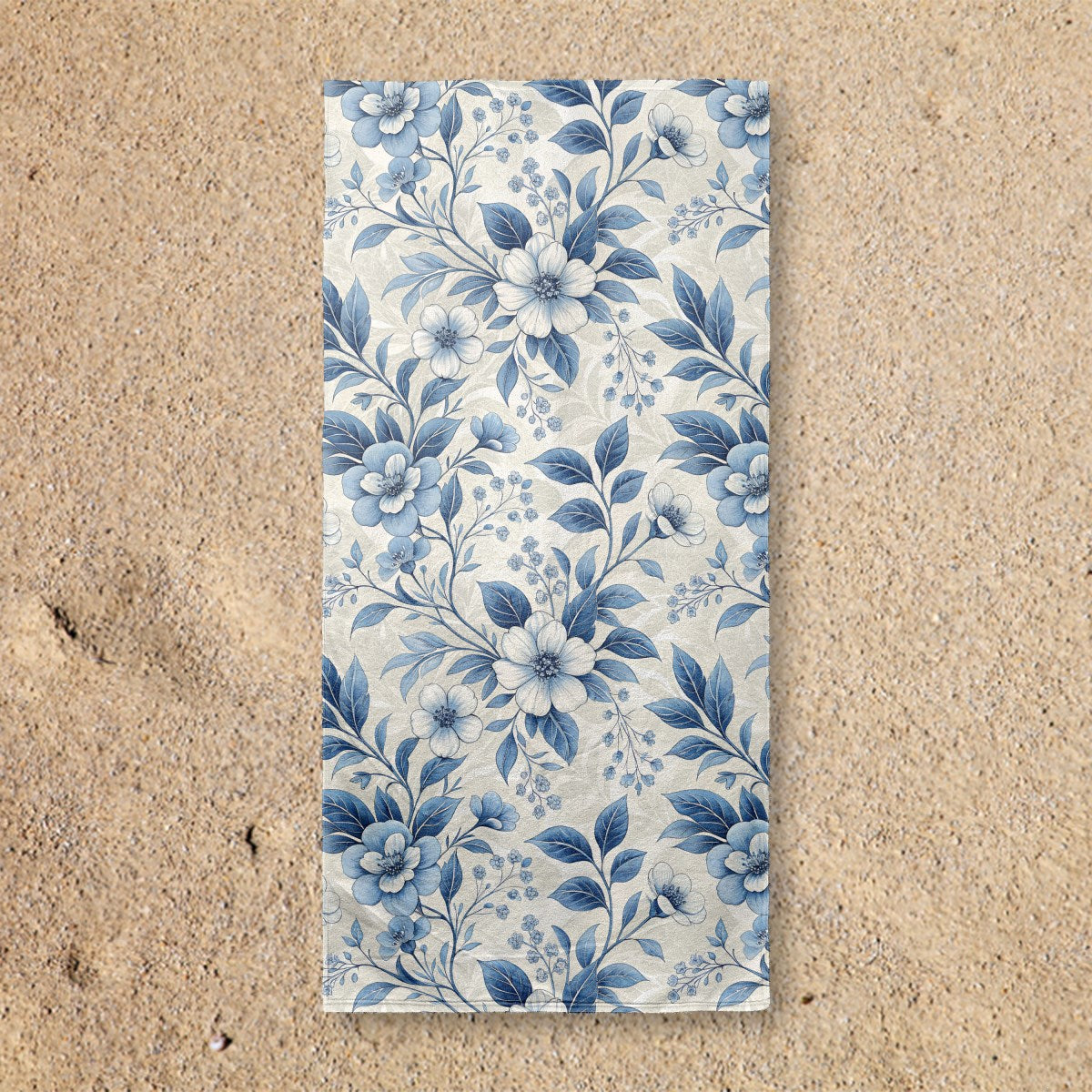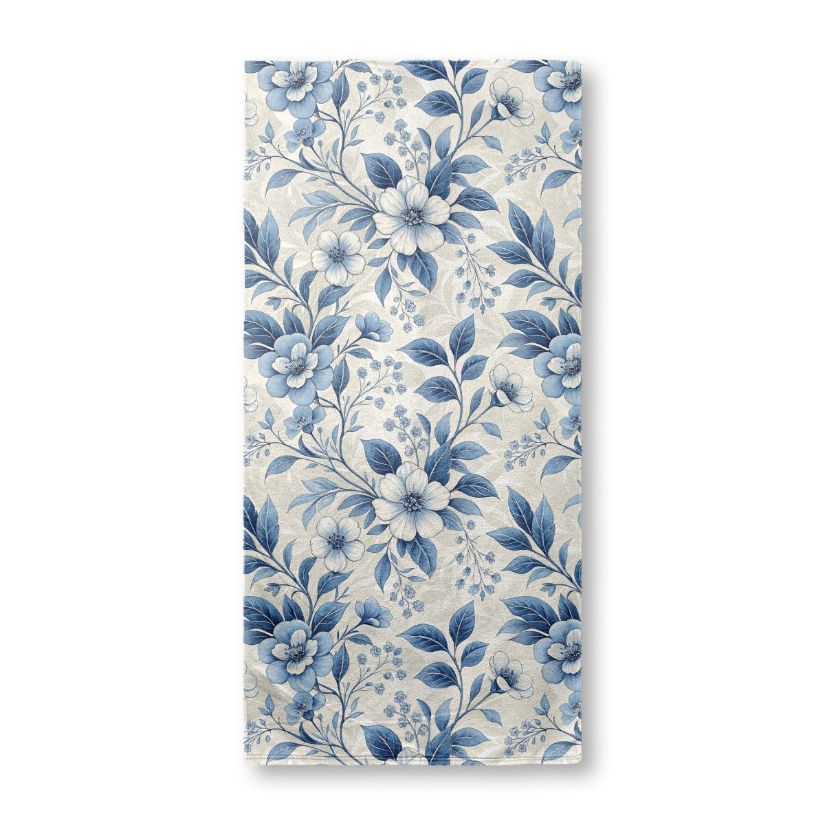 This is an elegant, seamless floral pattern in a classic blue and white palette. Intricately drawn flowers and leaves intertwine over a light, textured background, creating a timeless design reminiscent of vintage botanical illustrations or fine porcelain.