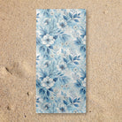 This watercolor illustration depicts a delicate floral pattern. White flowers with dark centers and deep blue leaves are intertwined on winding stems. The composition is set against a soft, mottled light blue background, creating a serene and elegant design.