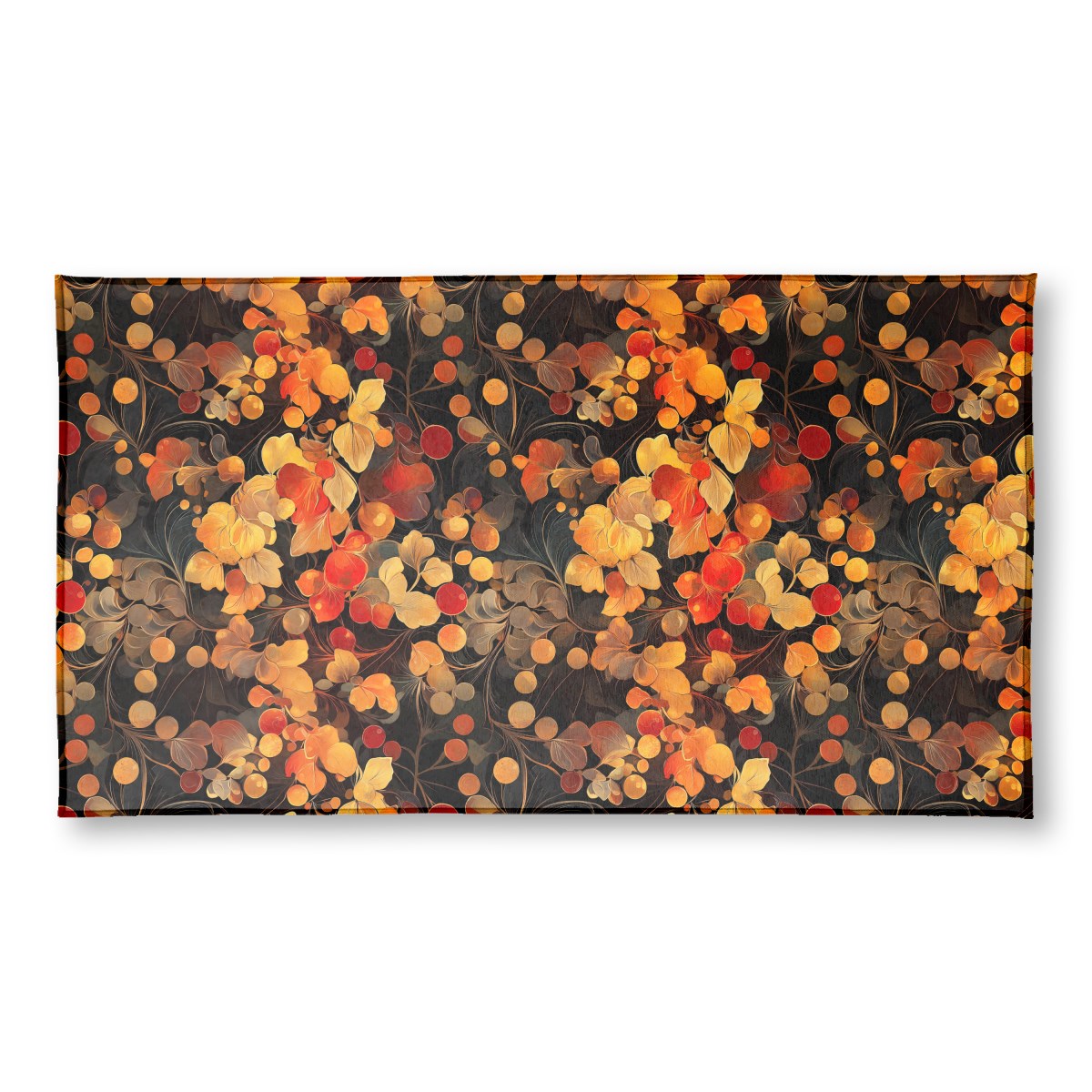 A vibrant, stylized botanical pattern features glowing leaves and berries in warm autumnal shades of orange, red, and yellow. The elegant, swirling elements are set against a dark background, creating a rich and dynamic composition with a painterly feel.