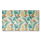 A vibrant, stylized illustration of a tropical pattern featuring orange Bird of Paradise flowers and lush greenery. Various leaves, including green Monstera and palm fronds, plus a contrasting golden frond, are set against a clean, off-white background for a fresh, exotic look.