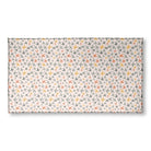 A seamless, modern pattern of stylized four-petaled flowers in varying sizes. The design features a muted, earthy color palette of green, orange, and yellow scattered playfully across a light, off-white background for a whimsical and abstract look.