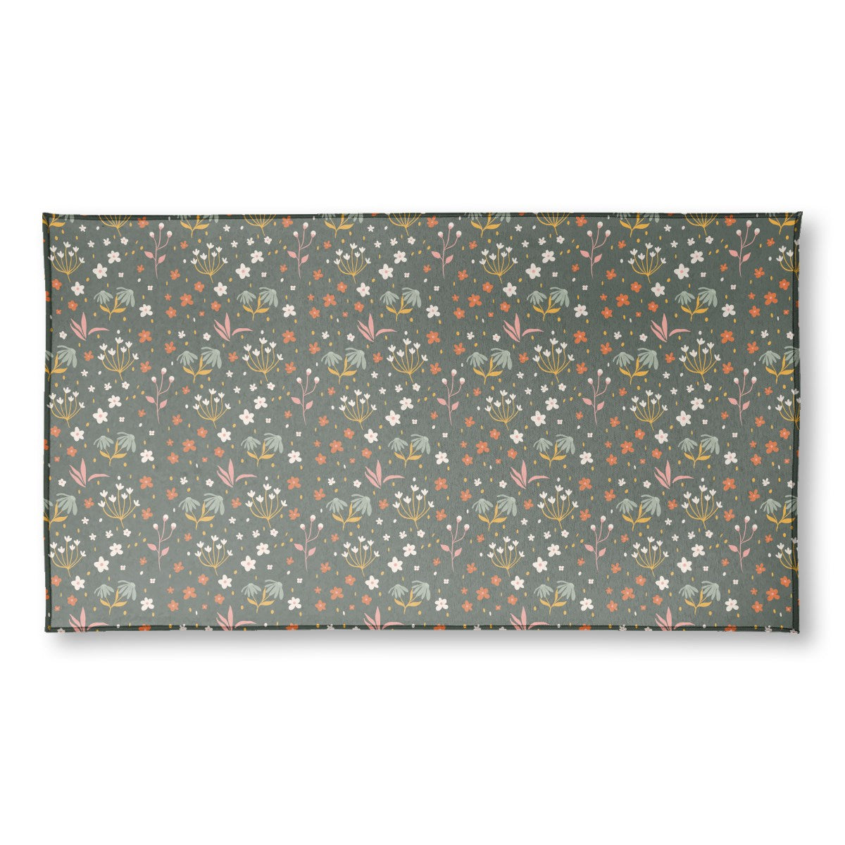 A seamless floral pattern on a dark green background features stylized wildflowers and leaves. The charming, whimsical design uses an earthy color palette of muted orange, white, sage green, pink, and mustard yellow, evoking a folk-art or vintage feel suitable for textiles.