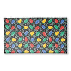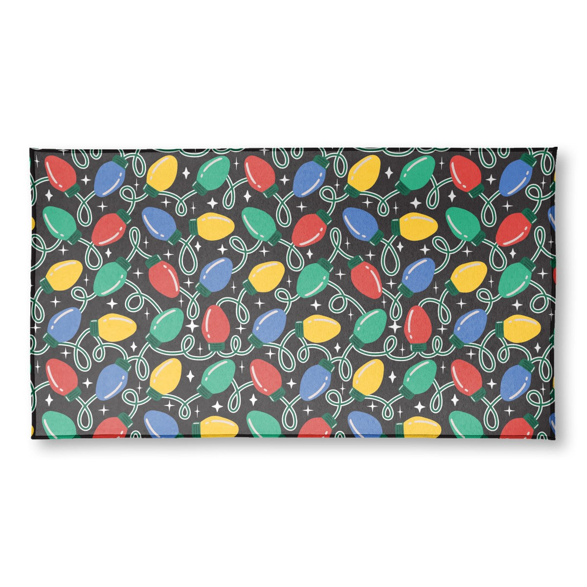 A festive, repeating pattern of colorful Christmas lights. The red, blue, green, and yellow bulbs are strung on looping white wires against a black background. White sparkles add a touch of magic to the cheerful, retro-style holiday design.