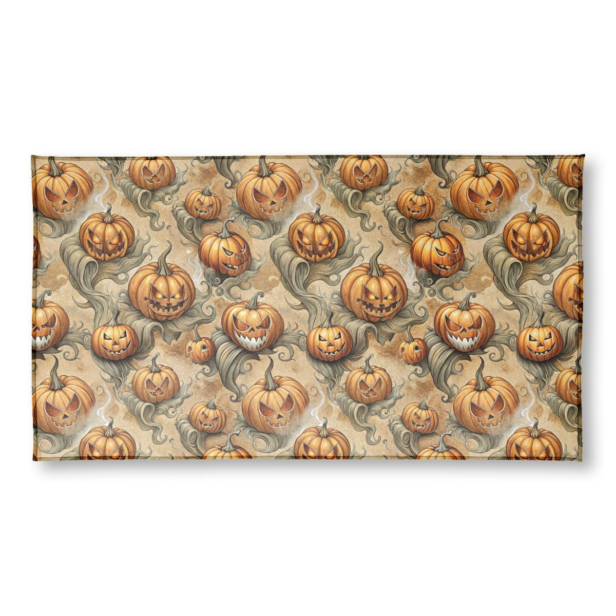 This is a spooky, seamless Halloween pattern of menacing jack-o'-lanterns. Each pumpkin features a unique, glowing, evil face and rests on gnarled, swirling tendrils against a textured, parchment-like background, creating an eerie and festive design.