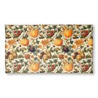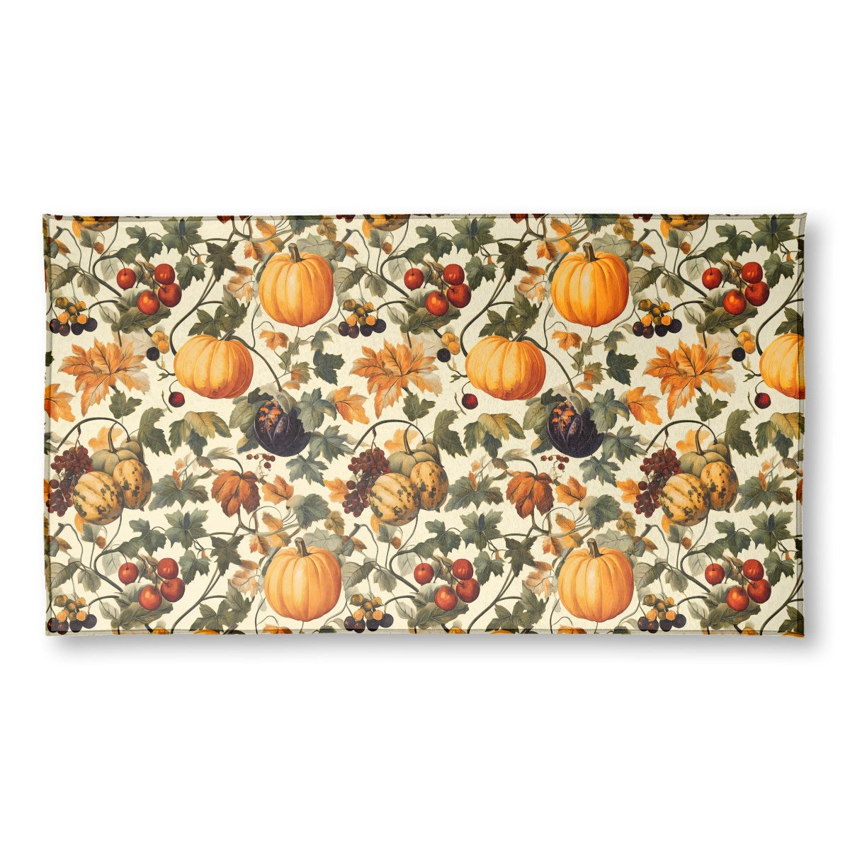 A vintage-style pattern illustrates a bountiful autumn harvest. Orange pumpkins, mottled gourds, grapes, and berries are interwoven with colorful fall leaves and twisting vines against a cream background, evoking a sense of seasonal abundance.