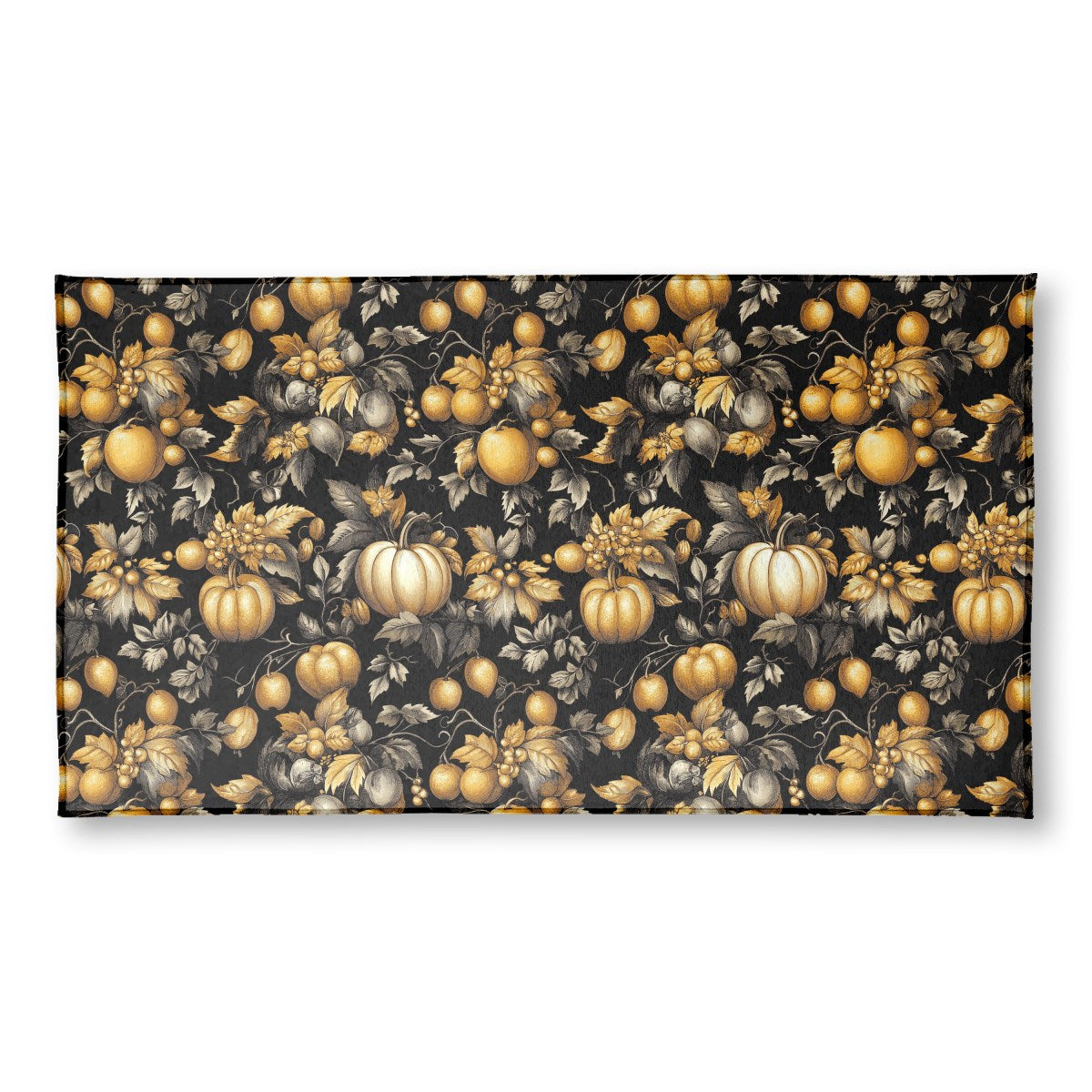 A luxurious, vintage-style pattern of autumnal fruits and foliage. Rendered in a detailed engraving style, golden pumpkins, apples, and grapes contrast richly with silver-toned leaves against a dramatic black background, creating an opulent and seamless design.