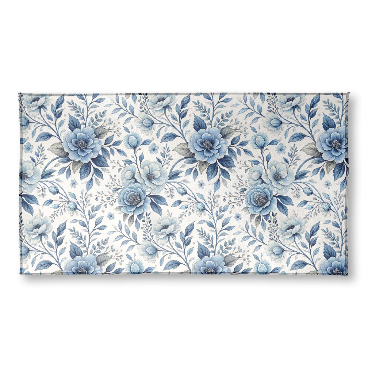 This image displays a seamless floral pattern with elegant, watercolor-style illustrations. Various blue flowers, from light to deep indigo, are intertwined with matching leaves and stems on a clean white background, creating a classic and delicate botanical design.