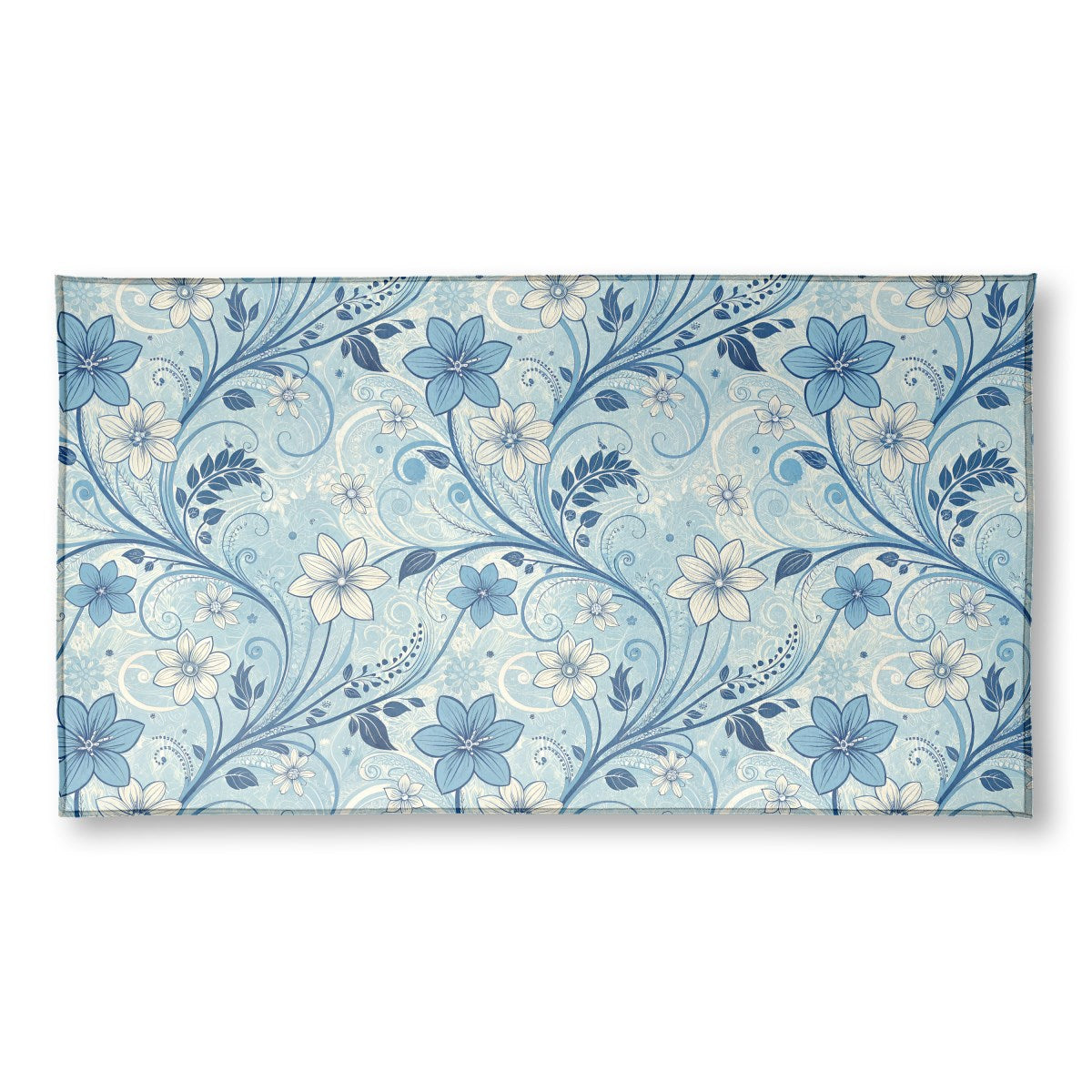 An elegant, seamless pattern of stylized flowers and swirling vines. The intricate design features a classic color palette of blue, navy, and cream against a light blue background, creating a delicate and decorative composition.