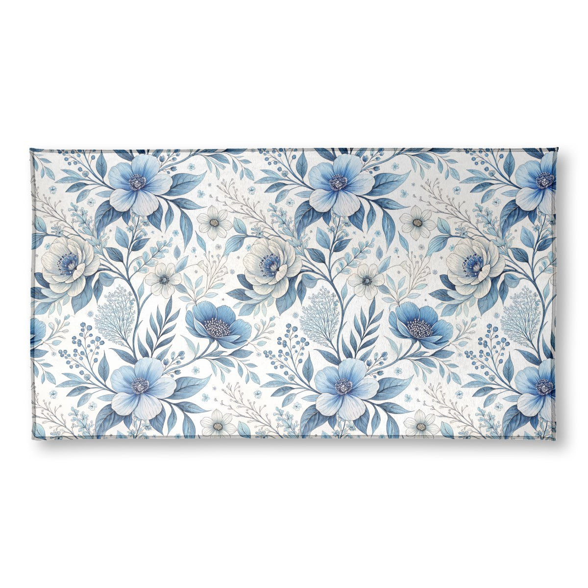 This is a delicate and intricate floral pattern featuring blue and white flowers, leaves, and berries. Rendered in a watercolor and ink-line style against a white background, the design creates a timeless and elegant botanical illustration.